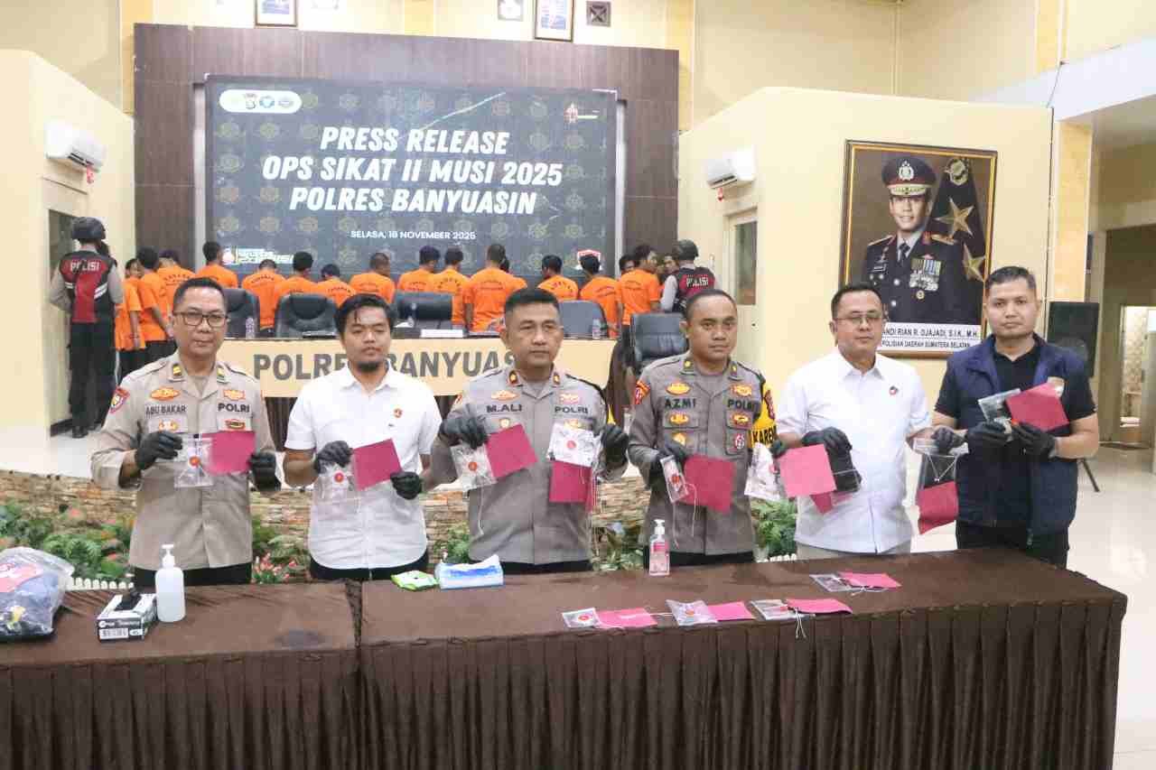 BANYUASIN, TRIKPOS.com — Polres Banyuasin mencatat hasil signifikan dalam Operasi Sikat II Musi 2025 yang berlangsung selama 15 hari, mulai 30 Oktober hingga 13 November 2025. Operasi yang digelar berdasarkan Surat Telegram Rahasia Kapolda Sumsel itu menyasar lima jenis kejahatan utama: Curat, Curas, Curanmor, narkoba, dan premanisme.