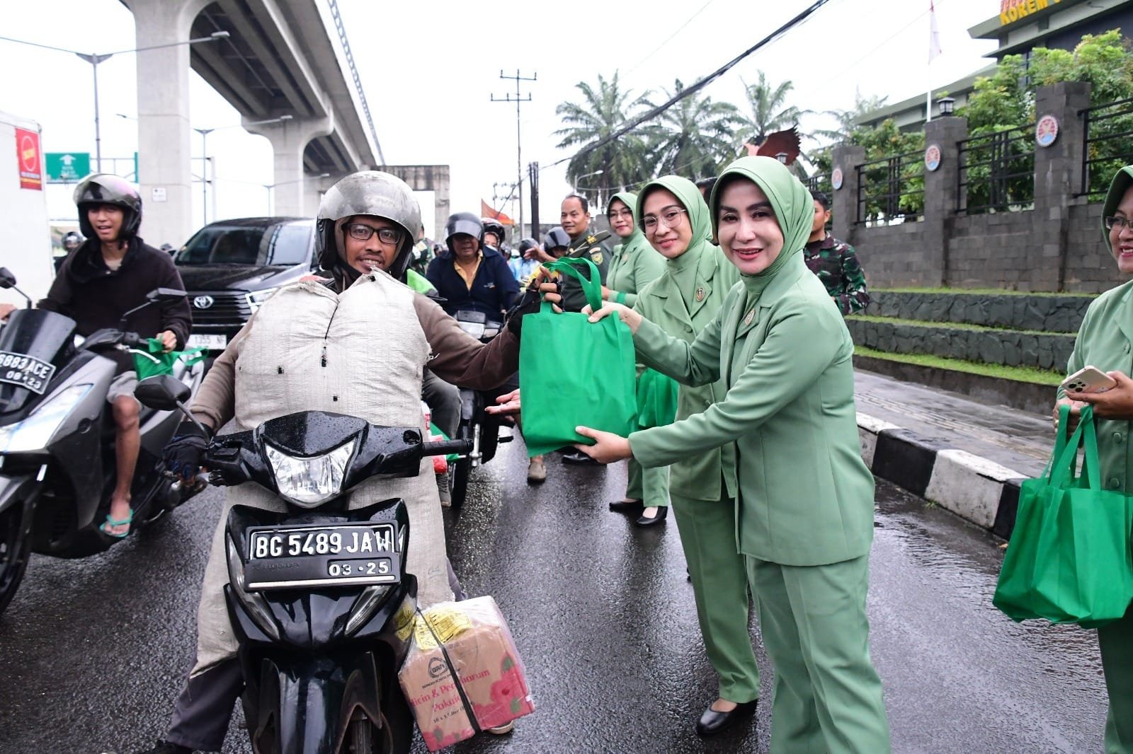 Ketua Persit KCK Koorcab Rem 044 PD II Sriwijaya Ny. Tina Thohir, turut serta dengan turun langsung membagikan Takjil gratis kepada masyarakat.
