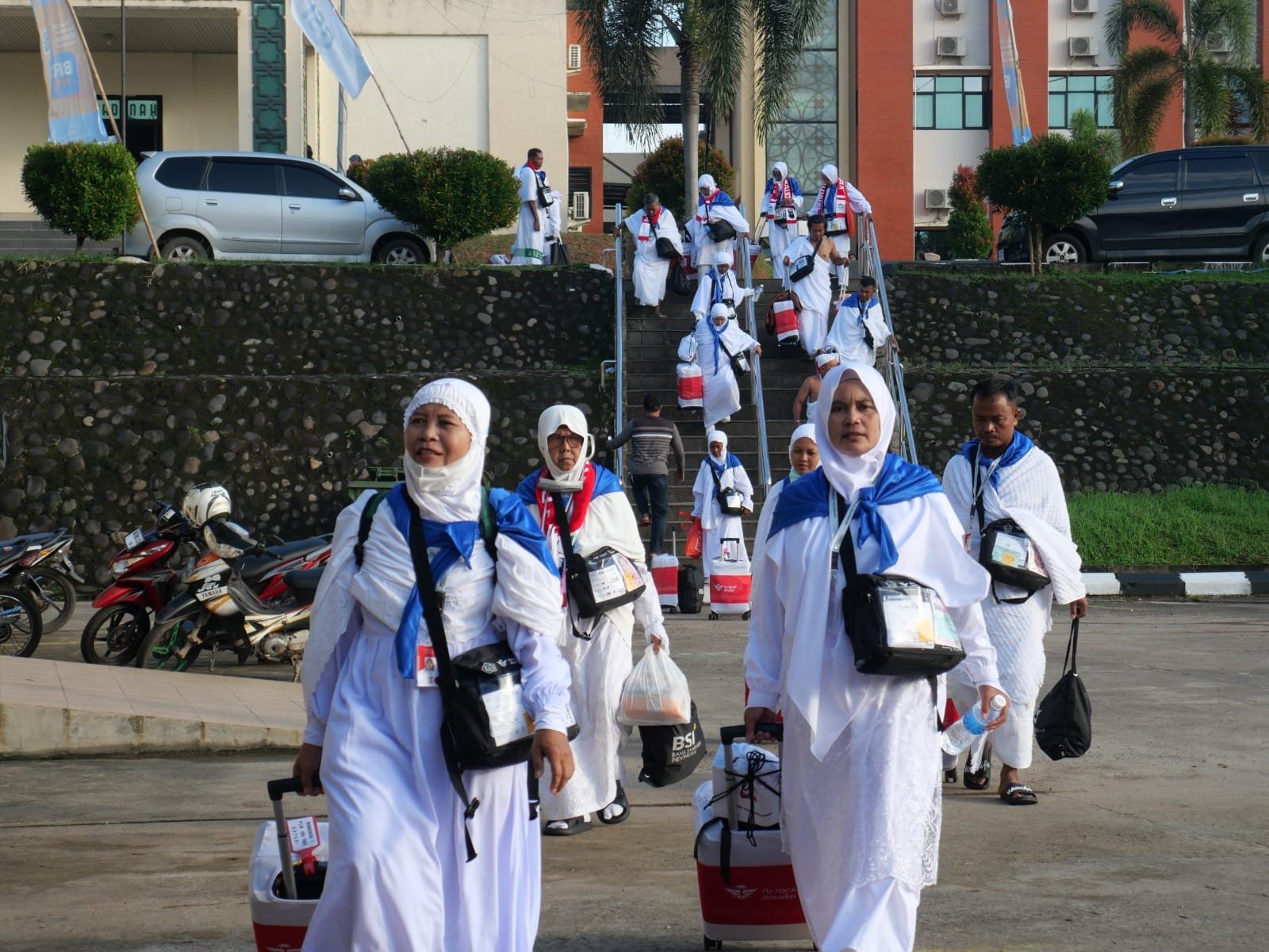 TRIKPOS.COM, PALEMBANG | Sebanyak 446 jemaah haji Kloter 10 Embarkasi Palembang asal Kabupaten OKU Timur bertolak meninggalkan Bandara SMB II Palembang menuju Bandara King Abdul Aziz, Jeddah, Jumat (24/05/2024) siang. Satu jemaah atas nama Pahmin Marto Yahmin (84) asal Belitang terpaksa ditunda berangkat karena sakit.