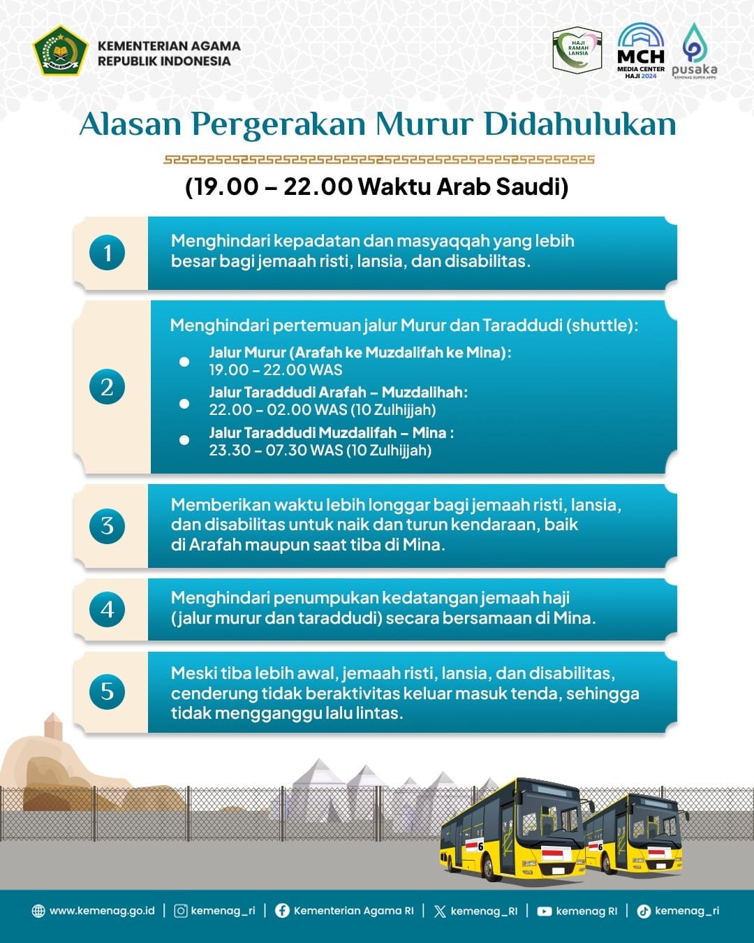 “Keberangkatan jemaah dengan skema _murur_ lebih awal, akan memberikan waktu lebih longgar bagi jemaah risti, lansia, dan disabilitas untuk naik dan turun kendaraan, baik di Arafah maupun saat tiba di Mina. Jadwal _murur_ lebih awal juga akan menghindari penumpukan kedatangan jemaah haji di Mina,” sambungnya.