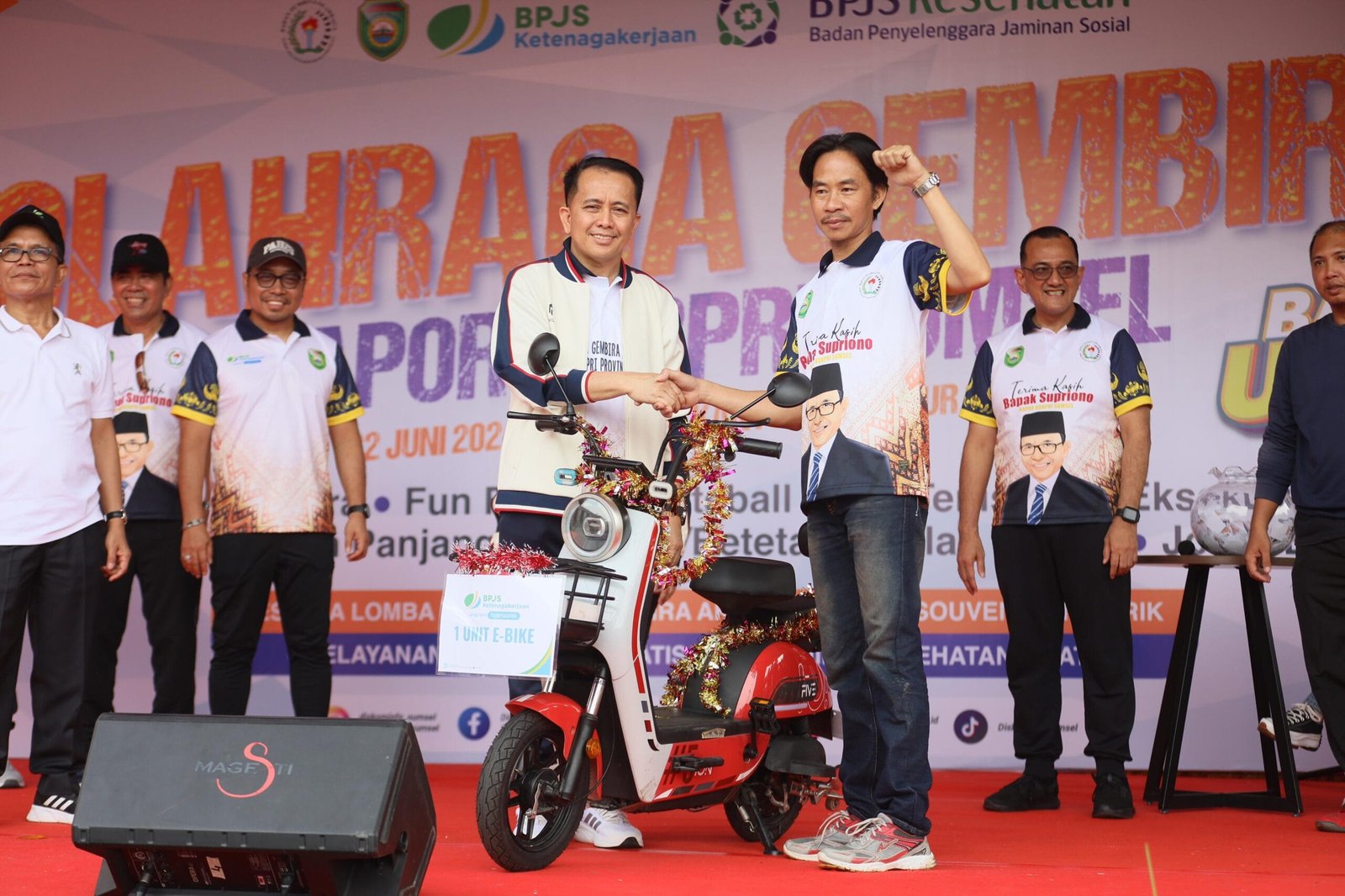 TRIKPOS.COM, PALEMBANG | Penjabat (Pj) Gubernur Sumatera Selatan Agus Fatoni didampingi Pj ketua Tim Penggerak (TP) Pemberdayaan Kesejahteraan Keluarga (PKK) Sumsel Tyas Fatoni turut memeriahkan Olahraga Gembira yang digelar Badan Pengurus Olahraga (Bapor) Korps Pegawai Republik Indonesia (Korpri) Sumsel. Kegiatan ini berlangsung di Halaman Kantor Gubernur Sumsel, Palembang, Sumatera Selatan, Sabtu (22/6/2024).