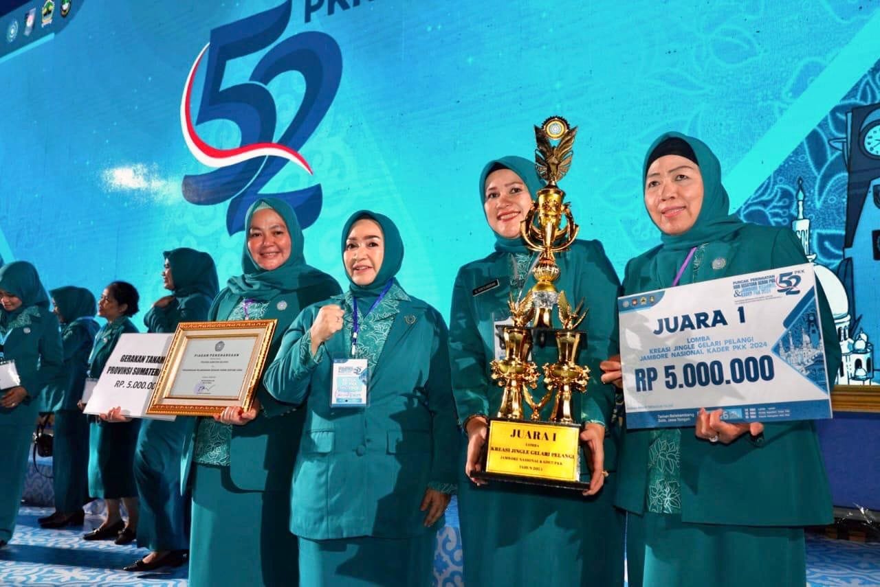 TRIKPOS.COM, SOLO | Penjabat (Pj) Ketua Tim Penggerak (TP) Pemberdayaan Kesejahteraan Keluarga (PKK) Provinsi Sumatera Selatan (Sumsel) Tyas Fatoni bangga dengan deretan prestasi yang diraih TP PKK Sumsel dalam ajang Jambore Nasional PKK di Solo, Jawa Tengah. Penghargaan tersebut diserahkan langsung oleh Ketua Umum TP PKK Tri Tito Karnavian dalam puncak peringatan Hari Kesatuan Gerak (HKG) Pemberdayaan Kesejahteraan Keluarga (PKK) Ke-52 di Taman Balekambang, Surakarta, Kamis (16/5/2024).