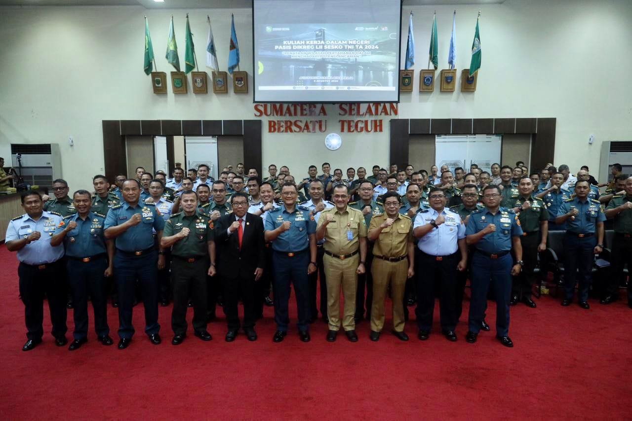 TRIKPOS.COM, PALEMBANG – Penjabat (Pj) Sekretaris Daerah Provinsi Sumatera Selatan (Sumsel), Drs H Edward Candra, M.H, memaparkan capaian kinerja Pemprov Sumsel di hadapan peserta Kuliah Kerja Dalam Negeri Pasis Dikreg LII Sesko TNI Tahun 2024 dengan tema “Penataan Wilayah Pertahanan Dalam Menghadapi Potensi Ancaman” yang berlangsung di Auditorium Graha Bina Praja Pemprov Sumsel pada Selasa (6/8/2024).