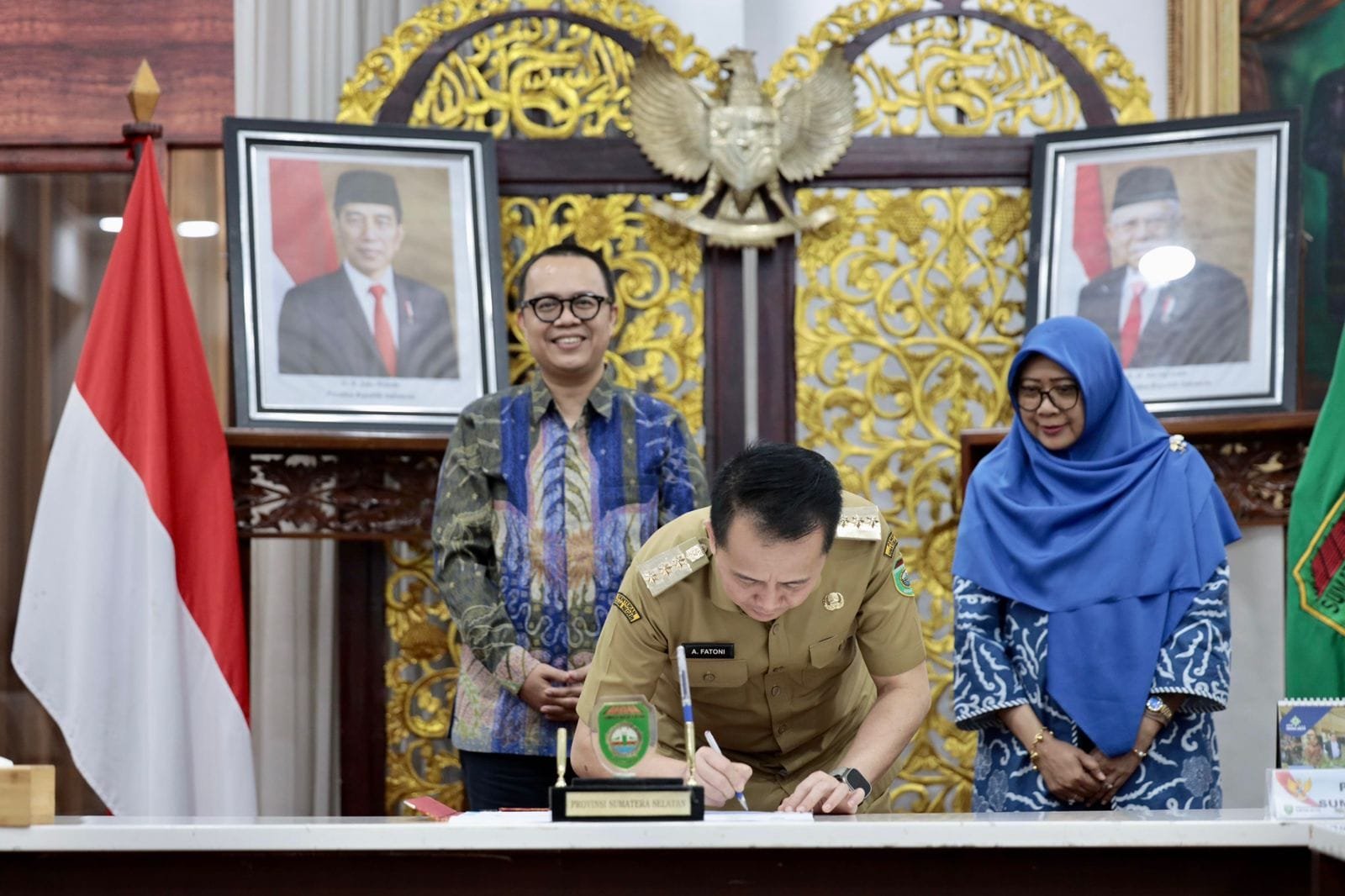 TRIKPOS.COM, PALEMBANG | Penjabat (Pj) Gubernur Sumatera Selatan (Sumsel) Agus Fatoni melakukan penandatanganan Memorandum of Understanding (MoU) atau nota kesepahaman Jejaring Pengampuan Layanan Prioritas antara Rumah Sakit Pengampu Nasional dan Rumah Sakit Pengampu Regional Pemprov Sumsel. Kegiatan ini berlangsung di Griya Agung, Palembang, Sumatera Selatan, Selasa (7/5/2024).