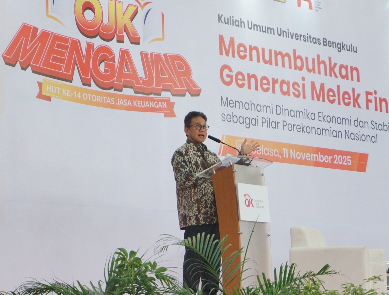 Pernyataan itu disampaikan Mirza saat mengisi kegiatan “OJK Mengajar” di Universitas Bengkulu (UNIB) bertema “Menumbuhkan Generasi Melek Finansial: Memahami Dinamika Ekonomi dan Stabilitas Keuangan sebagai Pilar Perekonomian Nasional”, Selasa (11/11).