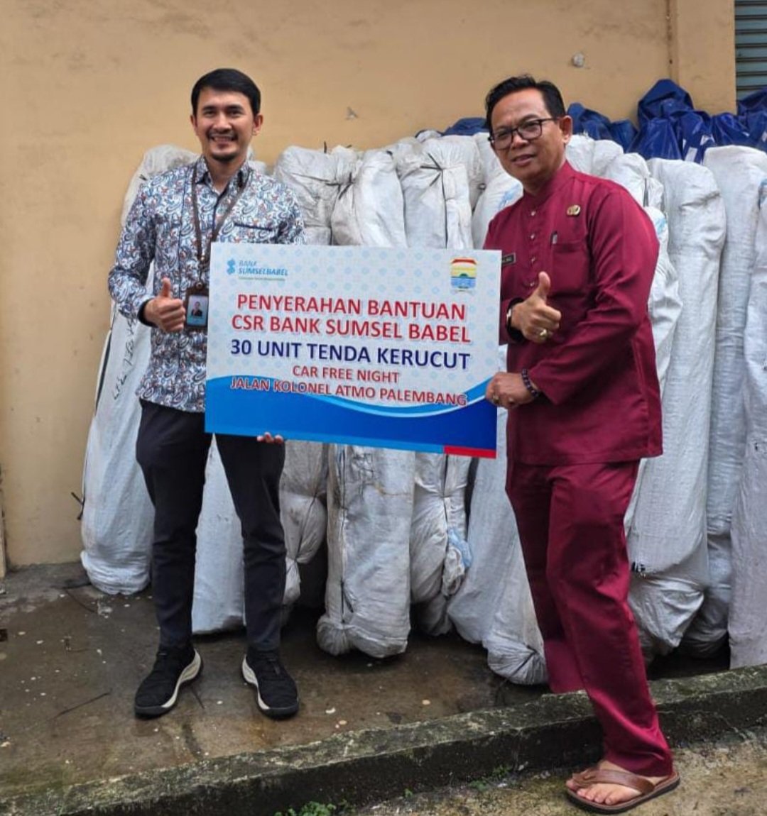 PALEMBANG, TRIKPOS.com — Bank Sumsel Babel melalui Cabang Palembang menyalurkan bantuan Corporate Social Responsibility (CSR) berupa tenda kerucut sebagai bentuk dukungan terhadap pengembangan kawasan Pedestrian Atmo yang kini menjadi pusat aktivitas masyarakat, termasuk dalam pelaksanaan Car Free Night (CFN) di Kota Palembang.