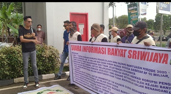 TRIKPOS.COM, PALEMBANG | Puluhan massa mengatasnamakan Suara Informasi Rakyat Sriwijaya (SIRA) menggelar aksi demontrasi di Halaman Gedung Kejati Sumsel, Rabu (27/3/2024). Massa mendesak Kejati Sumsel untuk melakukan Supervisi terkait dugaan korupsi pengelolaan dana BAZNAS Banyuasin yang diduga saat ini tengah ditangani oleh Kejari Banyuasin.