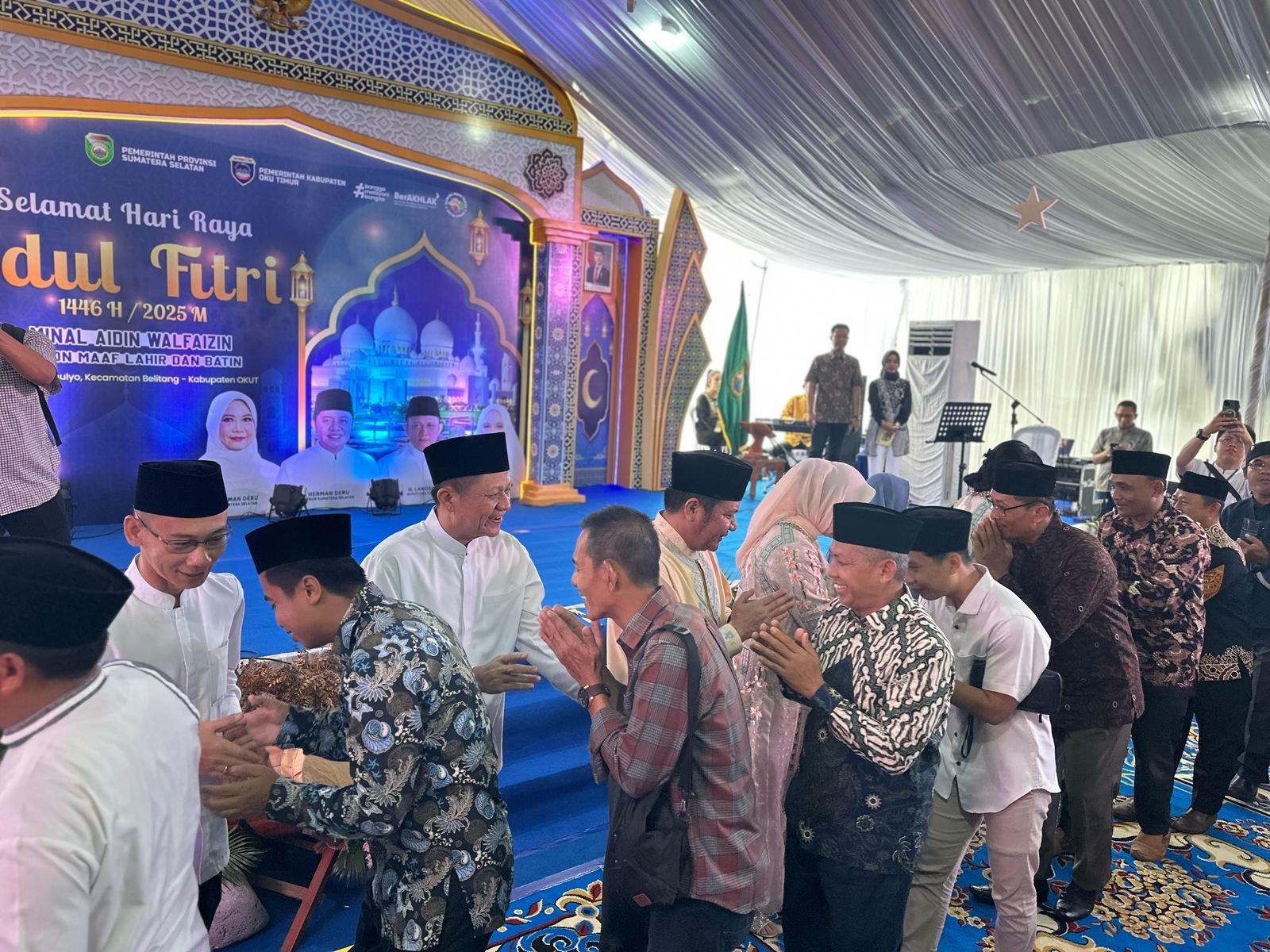OKU TIMUR , TRIKPOS com- Gubernur Sumatra Selatan, H. Herman Deru (HD), bersama Bupati OKU Timur, Ir. H. Lanosin, M.T., M.M., serta keluarga, menggelar acara Halal Bihalal dalam rangka Hari Raya Idul Fitri 1446 H di Desa Sidodadi, Kecamatan Belitang, pada Kamis (3/4/2025). Kegiatan ini disambut dengan antusias oleh ribuan masyarakat yang hadir.