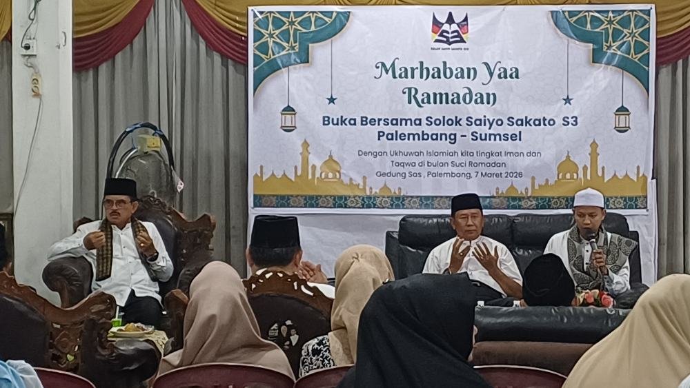 PALEMBANG, TRIKPOS.com – Warga perantau Minangkabau yang tergabung dalam Solok Saiyo Sakoto (S3) Kota Palembang, Sumatera Selatan, menggelar kegiatan buka puasa bersama bertema “Dengan Ukhuwah Islamiah Kita Tingkatkan Iman dan Taqwa di Bulan Suci Ramadan” di Gedung SAS, Sabtu (7/3/2026).