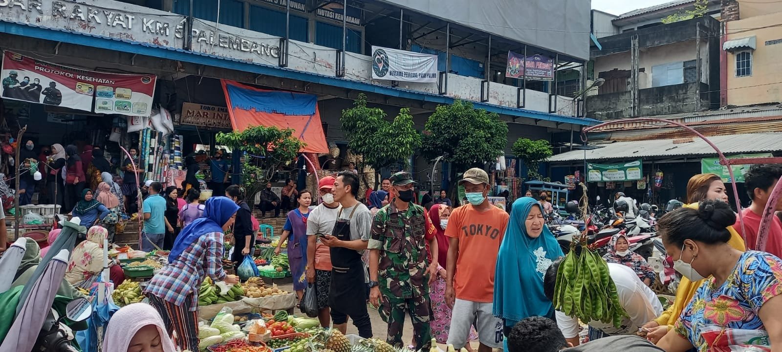 TRIKPOS.COM, PALEMBANG | Satgas Koramil 418-06/Kamboja tak henti-hentinya melakukan sosialisasi kepada masyarakat terkait bahaya covid-19, monitoring dilakukan di Pasar Km 5, Jalan Kol Hburlian, Rt 03 Rw 01, Palembang, Minggu (13/3/2022).
