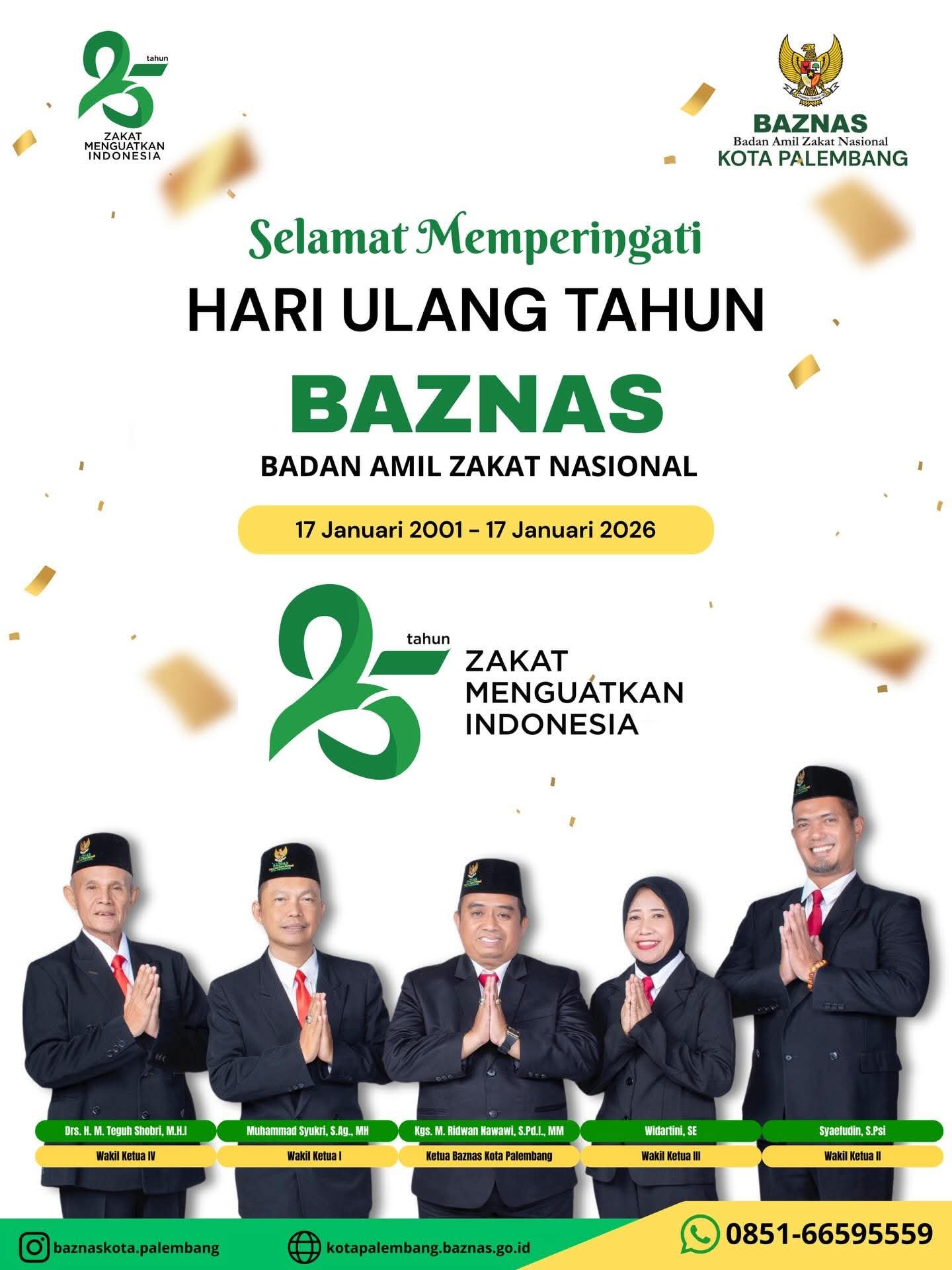 Mengusung tema nasional “Zakat Menguatkan Indonesia”, BAZNAS Kota Palembang optimistis zakat akan terus menjadi pilar penting dalam mewujudkan kesejahteraan masyarakat, keadilan sosial, serta memperkuat persatuan di Kota Palembang.