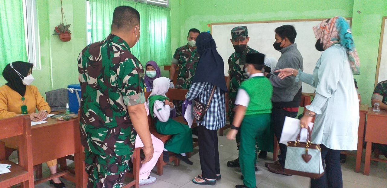 PALEMBANG | Kodim 0418/Palembang bersama tim tenaga kesehatan dr RS AK Gani Palembang kembali melaksanakan vaksinasi Covid-19 untuk anak atau pelajar usia 6-11 tahun di Madrasah Ibtidaiyah Negeri 1, Jln. Jendral Sudirman, Km 4 Palembang, Senin (21/2/2022).