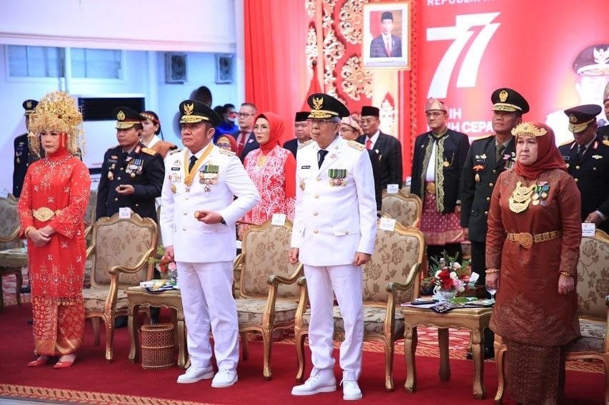 TRIKPOS.COM, PALEMBANG – Usai menjadi Irup HUT RI di halaman Griya Agung, Gubernur Herman Deru didampingi Ketua TP PKK Sumsel Hj Febrita Lustia HD, bersama Wakil Gubernur Sumsel Mawardi Yahya dan para Forkopimda Sumsel pukul 10.00 Wib di Griya Agung mengikuti Upacara Peringatan Detik-detik Proklamasi Kemerdekaan RI ke 77 secara virtual yang dengan Irup Presiden RI Joko Widodo di Istana Merdeka, Rabu (17/8).