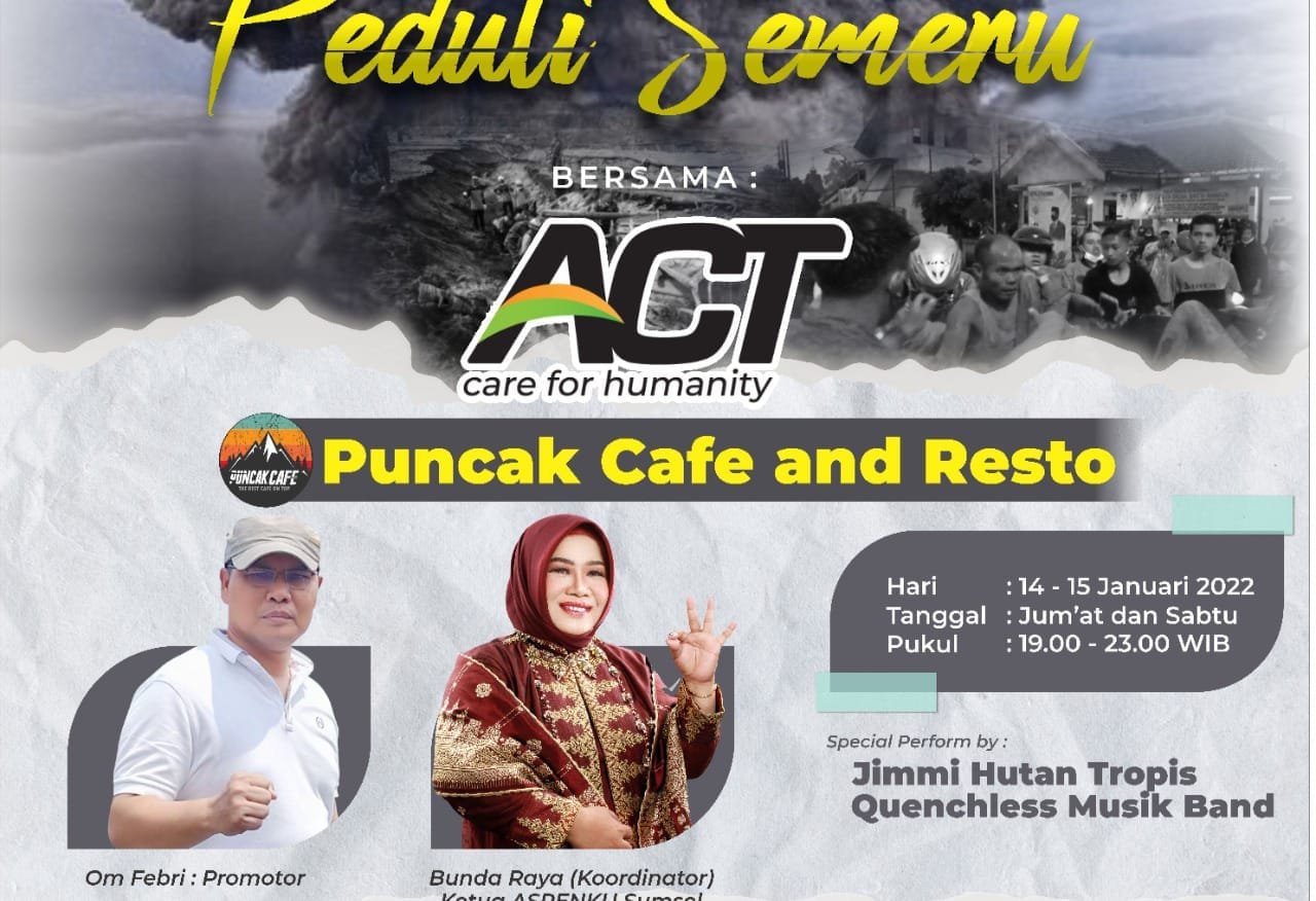 Ditempat yang sama, Ketua ASPENKU Sumsel, Bunda Raya yang juga merupakan koordinator kegiatan menyampaikan, bahwa kegiatan “Ngamen Amal Peduli Sumeru” bersama ACT di Puncak Cafe and Resto tersebut merupakan suatu momen yang tepat, dimana para penggiat sosial yang memang memiliki jiwa kemanusiaan tinggi disatukan dalam kepedulian terhadap sesama.