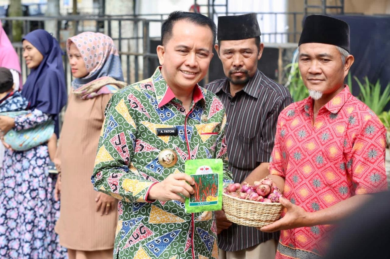 TRIKPOS.COM, PAGARALAM| Penjabat (Pj) Gubenur Sumatera Selatan (Sumsel) Agus Fatoni dan Pj Ketua Tim Penggerak (TP) Pemberdayaan Kesejahteraan Keluarga (PKK) Tyas Fatoni membagikan bantuan bibit cabe dan bawang kepada sejumlah kelompok tani.